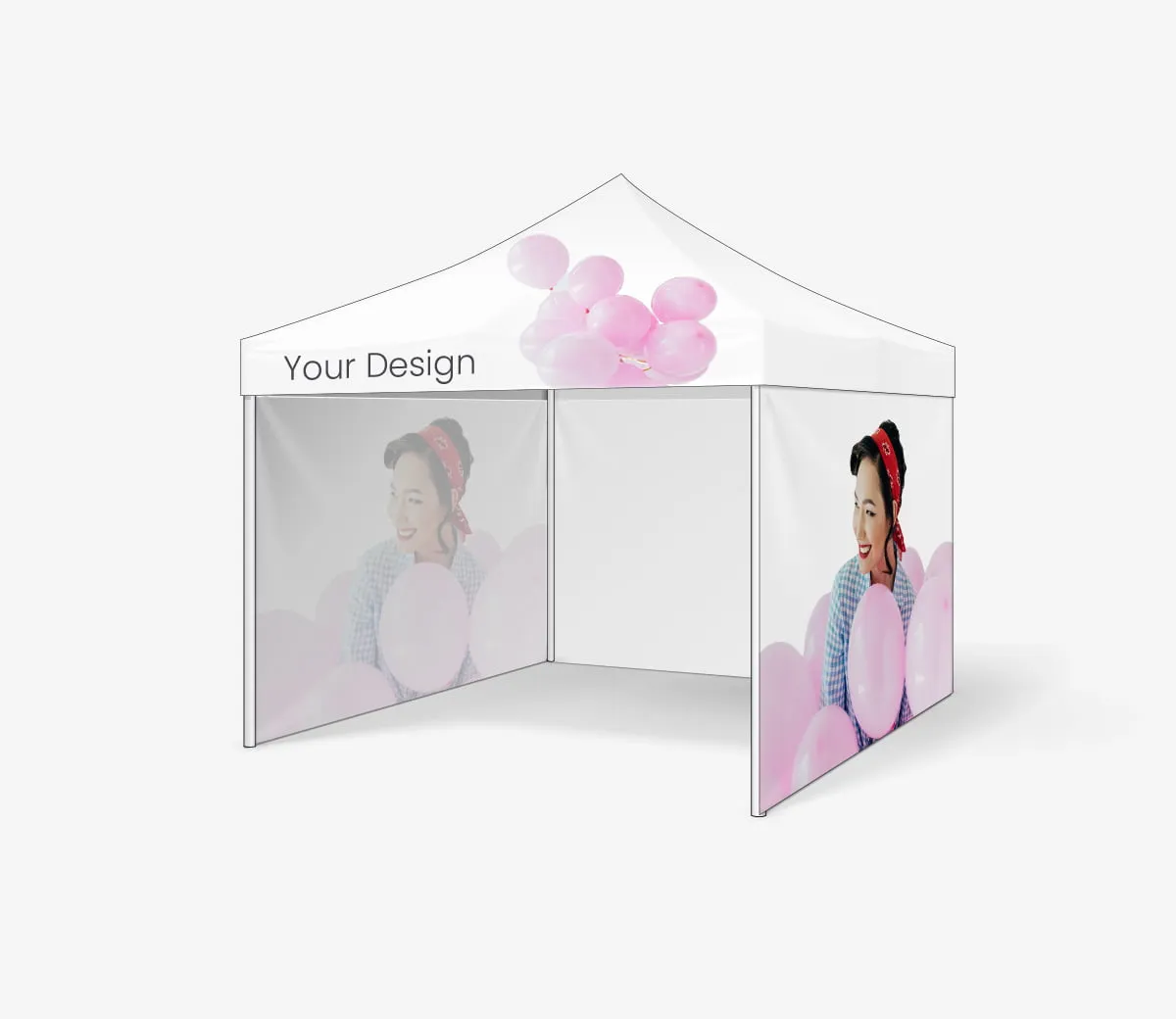 - Vlastnosti: personalizovaný potisk střechy a stěn, odolnost proti větru, nepromokavost