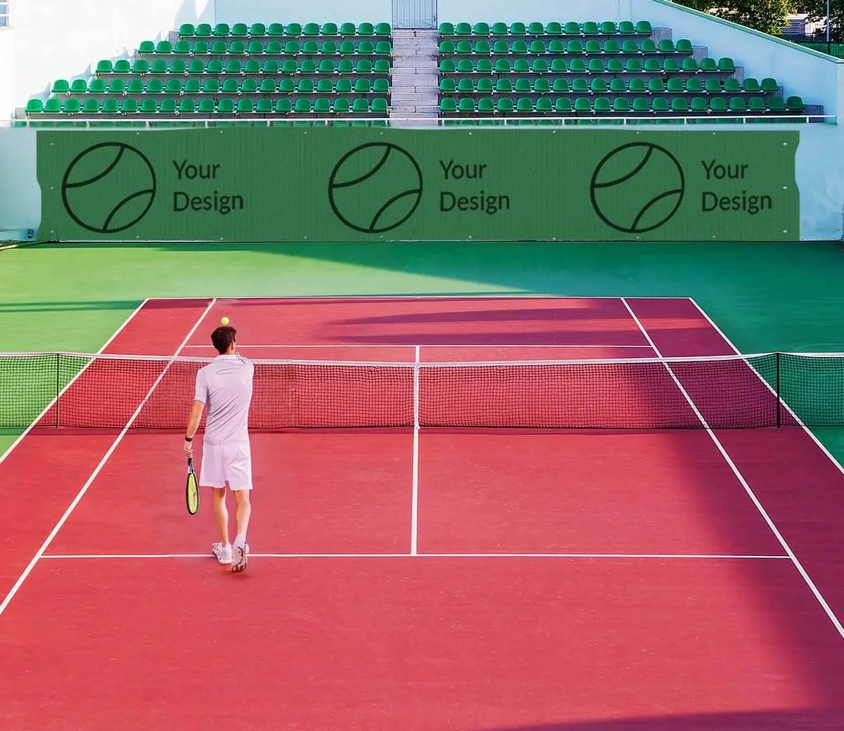 Ideální pro reklamu na kurtech a hřištích a jako účinná větrná a stínicí clona. Vyrobeno z odolného materiálu 200 g/m² s kvalitním UV potiskem až 600 dpi — zajišťuje estetický vzhled a funkčnost po dlouhá léta. Černé pozadí zvyšuje kontrast a viditelnost míče na zelených kurtech.