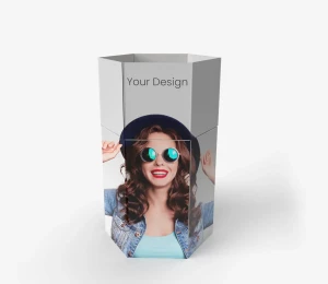 La superficie del expositor puede llevar cualquier diseño gráfico promocional impreso en tecnología UV (semimate), lo que permite personalizar el soporte y reforzar el mensaje de marca. Se entrega en plano como estructura lista para un montaje rápido, lo que facilita el transporte y el almacenamiento.