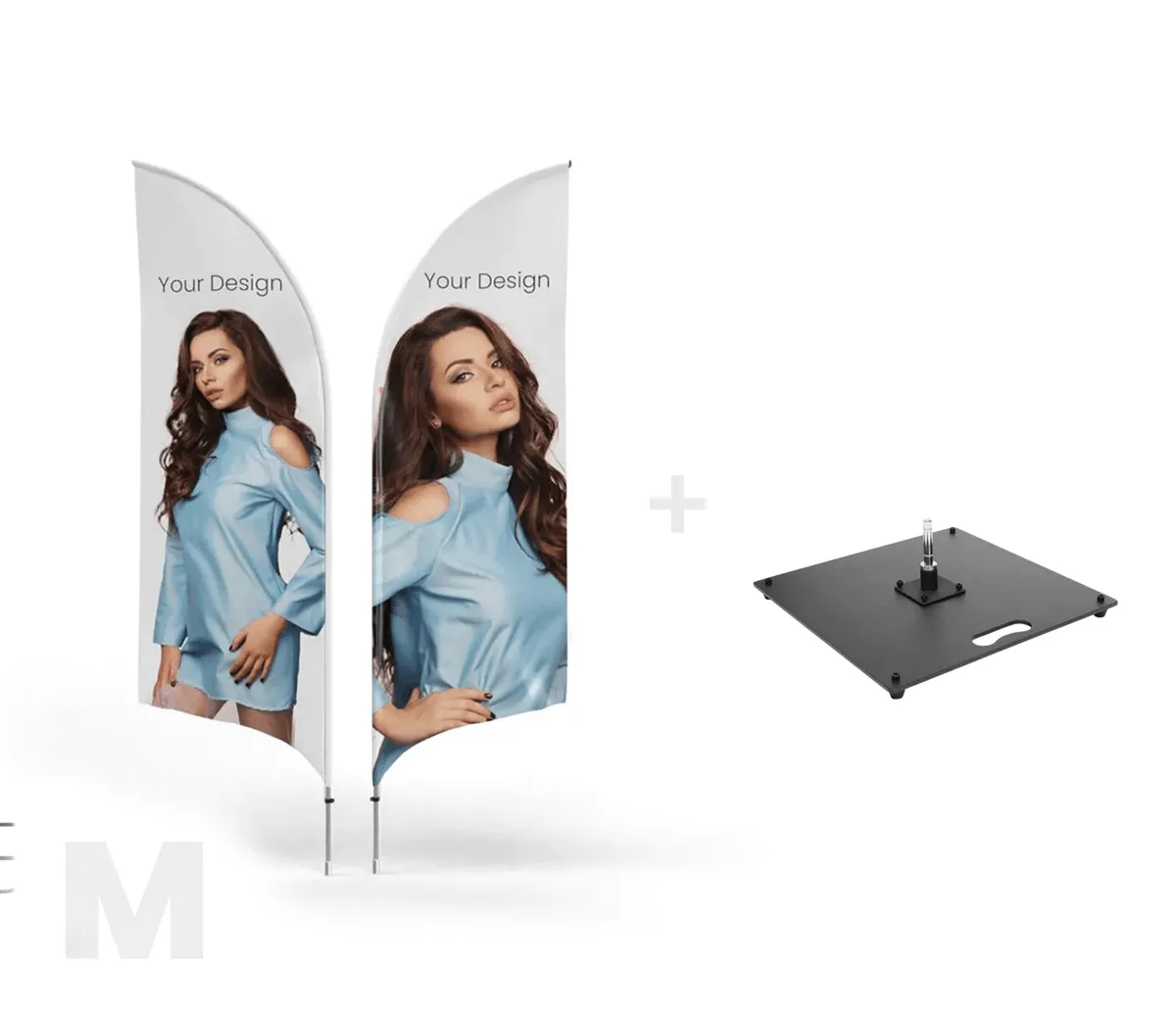 ¿Necesitas una beachflag grande, de doble cara, que se mantenga firme? Este pack lo resuelve: pide Curved M + Premium 20 kg, aprovecha el precio de pack y muestra tu marca sin concesiones.