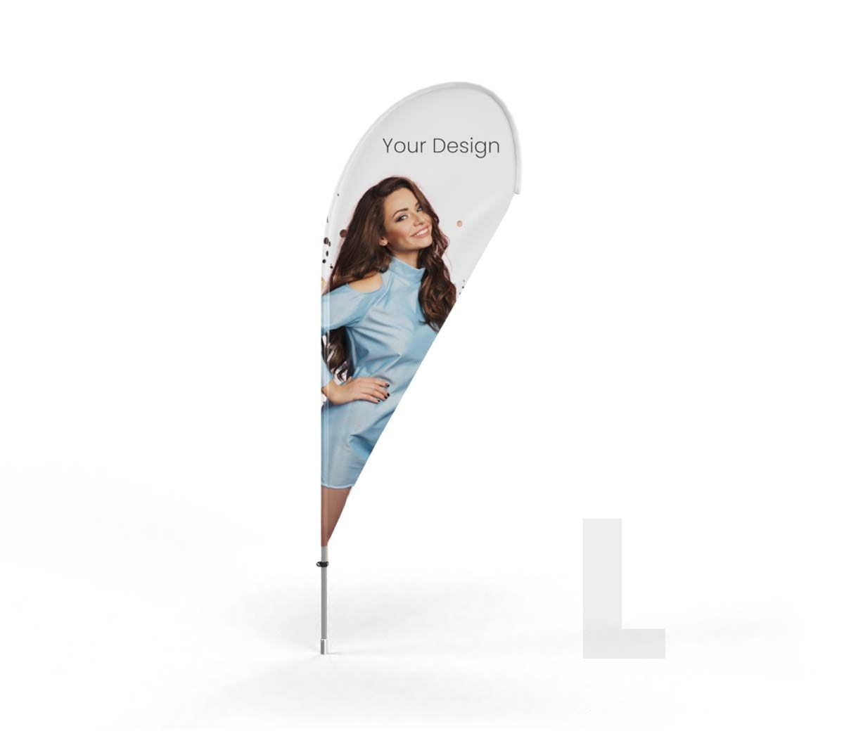 Beachflag llamativa con impresión personalizada por sublimación en poliéster de 115 g/m², diseñada para una exposición rápida tanto en exteriores como en interiores, con una gran superficie gráfica y un mástil alto.