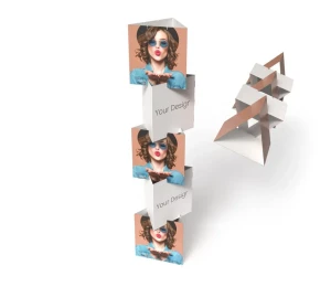 Totem publicitario autoportante y ligero, fabricado en cartón. Su estructura triangular garantiza una visibilidad total de 360°. Ideal para tiendas, cines, restaurantes y ferias. Montaje rápido, gran superficie de impresión y transporte económico en plano.