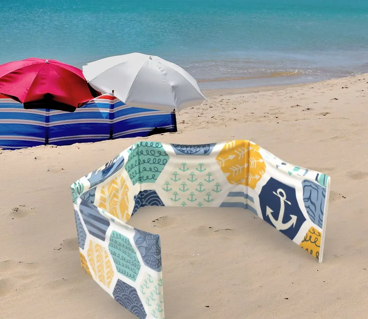 - Protecție și confort – oferă protecție eficientă împotriva vântului și nisipului pe plajă, picnicuri sau evenimente în aer liber.